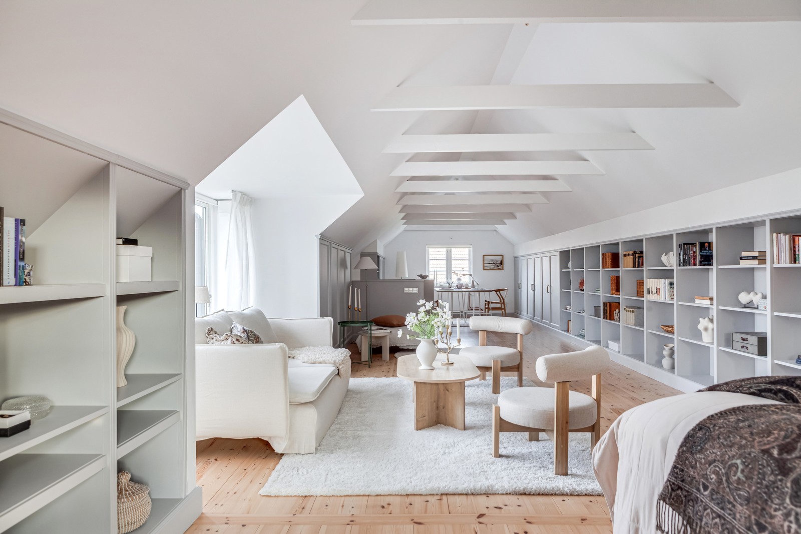 Allrum: Vitlaserade furutiljor på govlet. Väggar måade vita. Platsbyggd bokhylla. Möjligt att dela av så att det skapas två ytterligare rum.