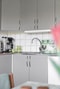 Stilrent kök med förvaring bakom släta luckor i ljusgrå kulör, rostfri bänkskiva, kaklat stänkskydd, plastmatta på golv och väggar klädda med bröstpanel och tapet. Vitvaror bestående utav induktionshäll (Electrolux), varmluftsugn (Electrolux), kyl och frys i fullhöjd (Elektrohelios) och diskmaskin (Miele).