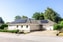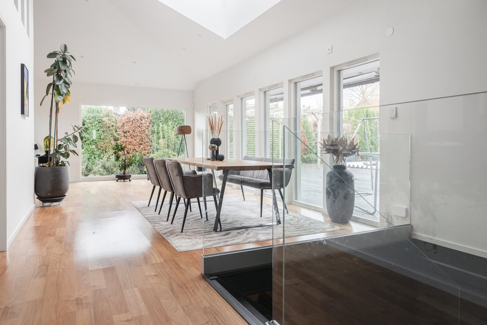 Huset är ett modernt enplanshus med stort fokus på ljusinsläpp tack vare de stora fönstren som sträcker sig från golv till tak.