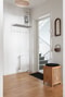 Kök med retrokänsla, köksinredning med skjutluckor, matplats vid fönster i väster.
