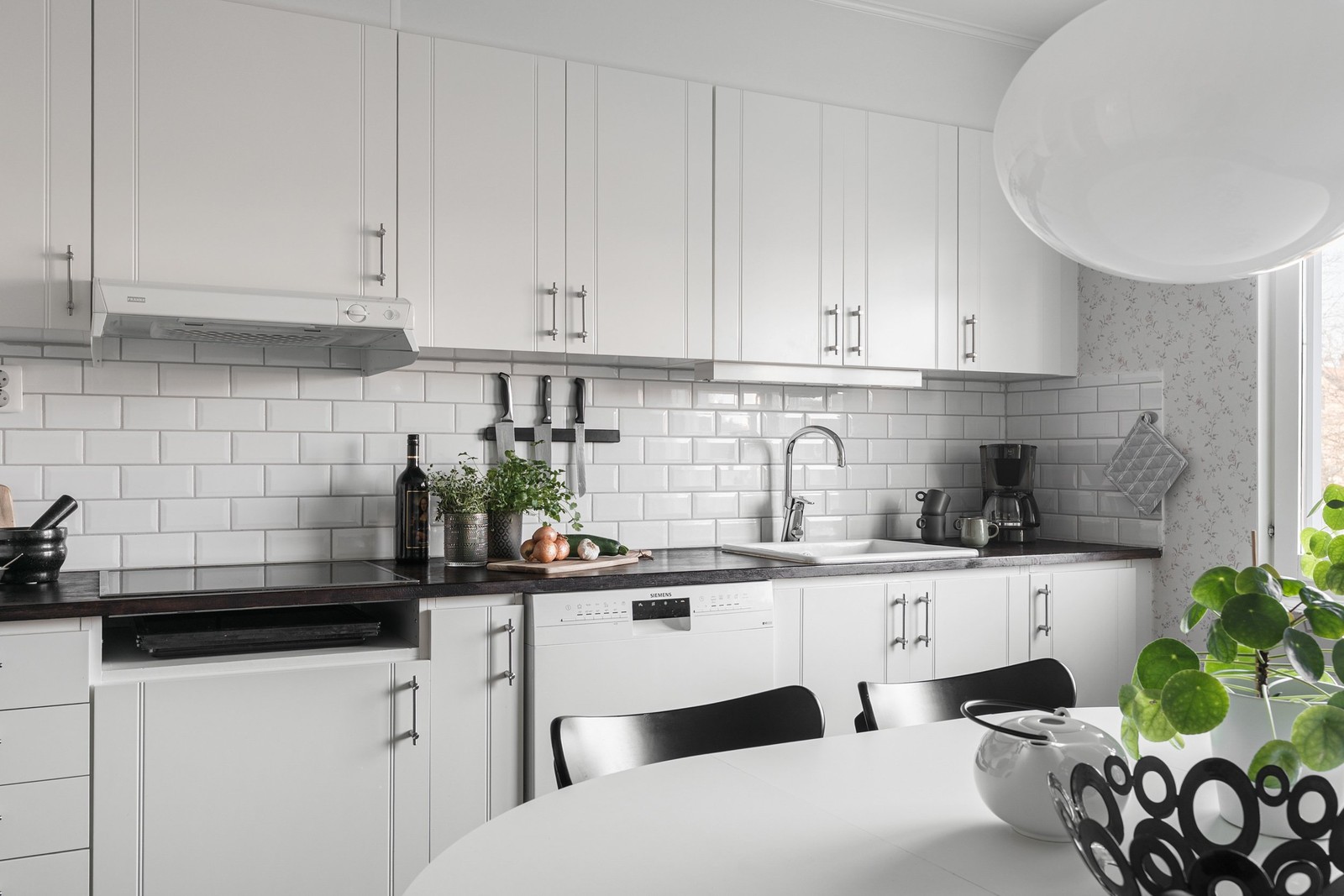 Köket är uppdaterat med smakfulla och tidlösa ytskikt och är fullt utrustat för vardagens matlagning. Här finns gott om plats för ett rejält köksbord där familj och vänner kan samlas. Från köksfönstret blickar du ut över ett grönområde med träd och lekplats, vilket ger en lugn och grön inramning.