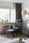 Vardagsrummet är rymligt och kan enkelt möbleras med flertalet möbelgrupper. Härifrån nås även balkongen där eftermiddagssolen kan avnjutas under årets varmare månader – en härlig förlängning av bostaden.