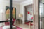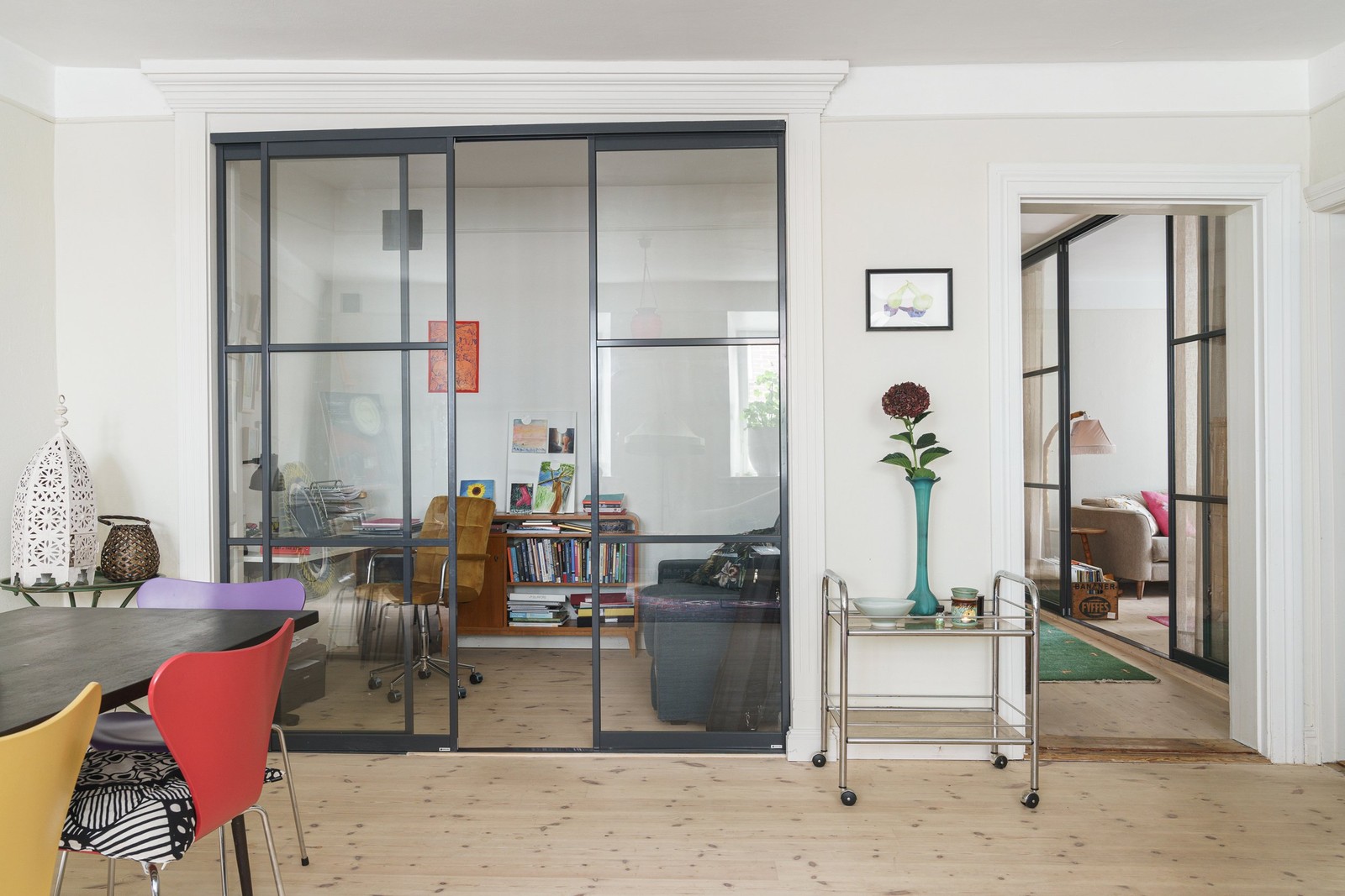 Stort allrum med furugolv, fönster i norr. Industriskjutdörrar mot ett praktiskt kontor med furugolv.