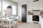 Klassiskt och tidlöst kök som renoverades 2023 med interiör från Epoq, vita spegelluckor, stänkskydd av vitt kakel, laminatbänkskiva och rostfria vitvaror bestående utav kombinerad kyl/frys, inbyggnadsugn, induktionshäll, spisfläkt och integrerad diskmaskin. På golvet ligger vinylgolv och väggarna är målade i grön kulör som snyggt bryter av mot den vita interiören.