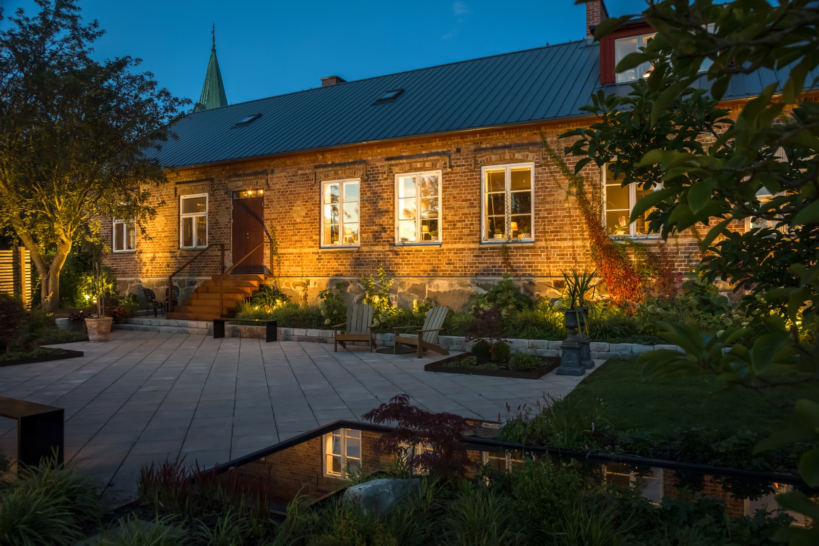 I trädgården finns en nyanlagd uteplats med vattenspegel. Den nås genom pardörrar i lärarinnas bostadsdel och den egenritade metalltrappan i roströd cortenstål. Intill uteplatsen finns också ett mysigt växthus/orangeri på 30 kvm för många, långa och härliga sommarkvällar. Här finns både vindruvor och persikor. Trädgårds- och fasadbelysning ger trädgården en extra dimension. Garage finns.