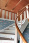 En vacker trätrappa leder upp till ovanvåningen med allrum och sovrum. Här är det är öppet upp till nock med framtagna bjälkar – en rofylld och luftig våning med fina fönsterpartier som adderar det där lilla extra.