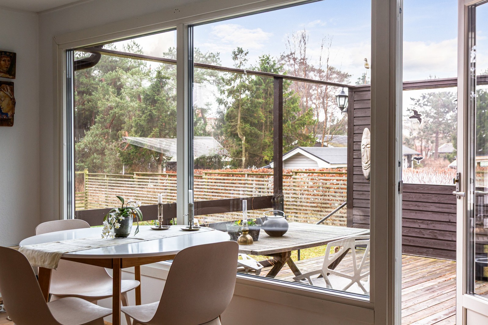 Inne på tomten ligger huset bra placerat. En naturlig trädgårdsyta bildas på södersidan. Altanen i sydväst är mysigt insluten av staket och glaspartier. Altandörren tar dig rakt in i huset hjärta - allrummet. Här väntar ett inbjudande rum med brädgolv och med mycket ljusinsläpp. Kaminen värmer gott och självklart är det även en stor mysfaktor. Här finns även en luftvärmepump från 2025. Sovrum med brädgolv, fönster i öster, garderober. Matrum med brädgolv. Kök med köksinredning i vitt, spis och fläkt från 2025.