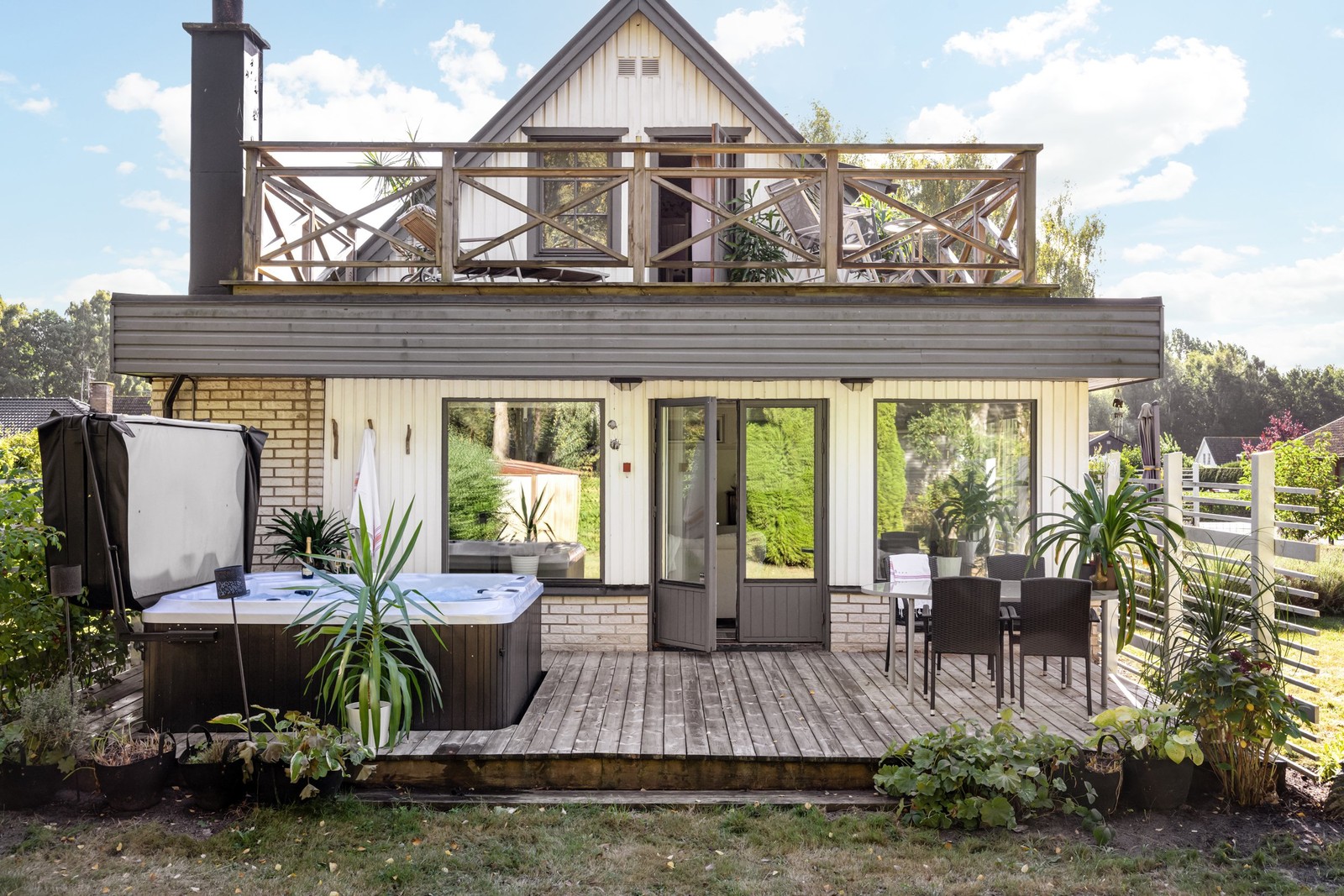 I entrén möts vi av en rymlig hall. Vidare in på första våningen finns två stora vardagsrum för att umgås med familj och vänner. Det finns även två kaminer, en i vardera vardagsrum. Från vardagsrummet i väst med sitt vackra granitgolv når vi det härliga trädäcket där man kan njuta av kvällssol och bada spabad. I husets mittersta vardagsrum finns det plats för större matbord. Köket ligger i trevlig anslutning till husets vardagsrum vilket gör att första våningen naturligt blir en plats där man samlas och umgås med nära och kära. På första våningen finns det också två rymliga sovrum, helkaklat badrum samt en praktisk tvättstuga. Via trappan i husets mitt kommer vi upp på ovanvåningen. Ovanvåningen erbjuder tre sovrum, ett badrum och två klädkammare. Sovrummet som vetter mot väster har sin egen balkong och sovrummet som vetter mot öster kan enkelt göras om till två mindre sovrum. Mellanrummet kan användas till allt från sovrum, kontor eller lekrum.