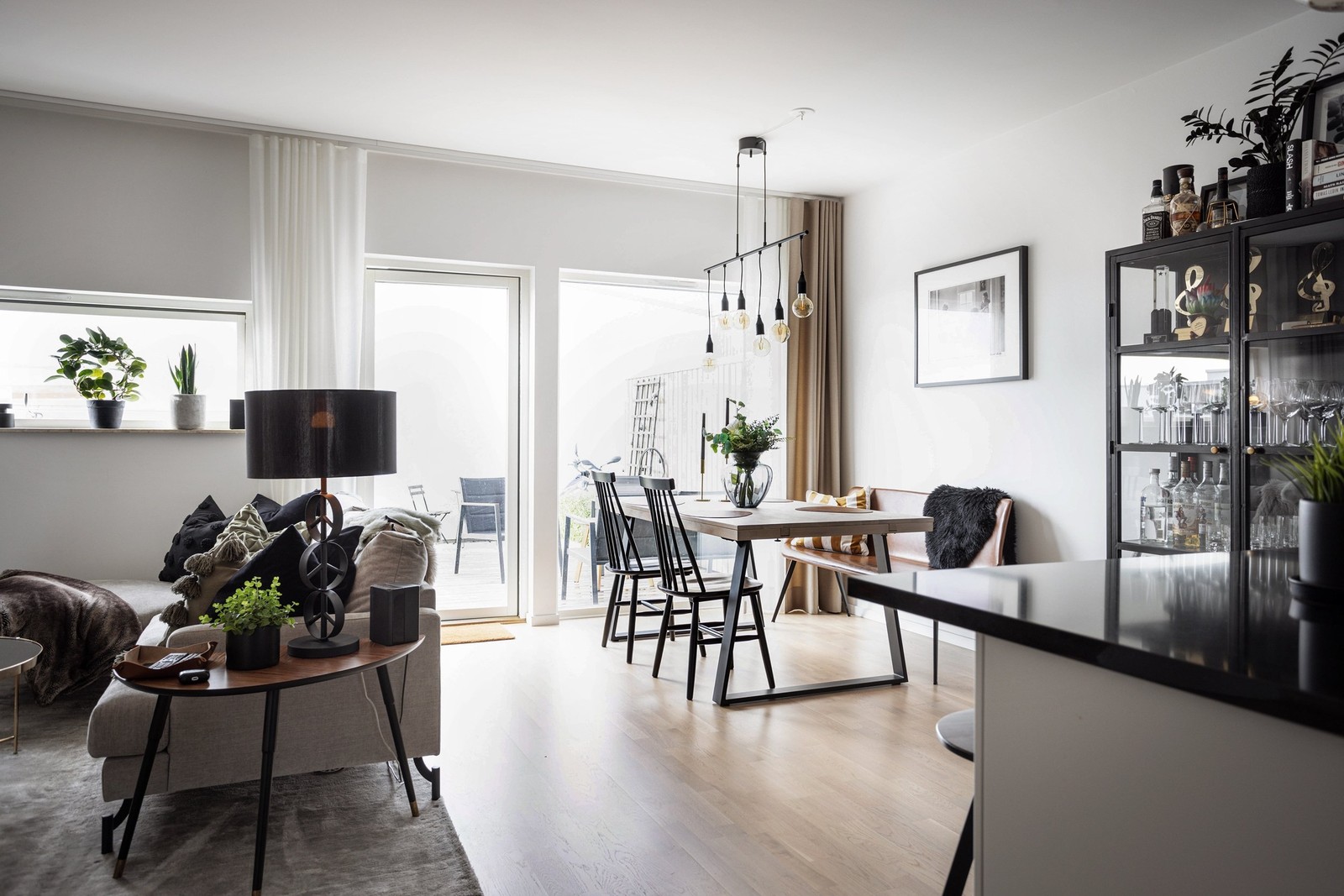 Den vitoljade ekparketten är genomgående i hela bostaden vilket ger en snygg helhetskänsla. Vardagsrummet ligger i öppen planlösning intill köket och de stora fönsterpartierna ger ett fint ljusflöde. Köket är ett Ballingslövs kök och vitvarorna i form av induktionshäll, ugn, side by side kyl/frys, fläkt, diskmaskin och fläkt är alla från Electrolux. Det vita kaklet bryter snyggt till den svarta granit stenskivan som även ligger på den praktiska köksön. Från vardagsrummet och köket har vi altandörren som leder ut till den härliga terrassen i syd/väst.