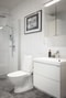 Stort härligt helkaklat badrum med golvvärme och handukstork. Här finns gott om förvaring i form av överskåpen ovanför tvättmaskinen och torktumlaren även dem från Electrolux. Dusch i klarglas med vikbara väggar. Toalett samt en snygg badrumskommod och ett spegelskåp med förvaring.