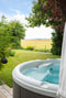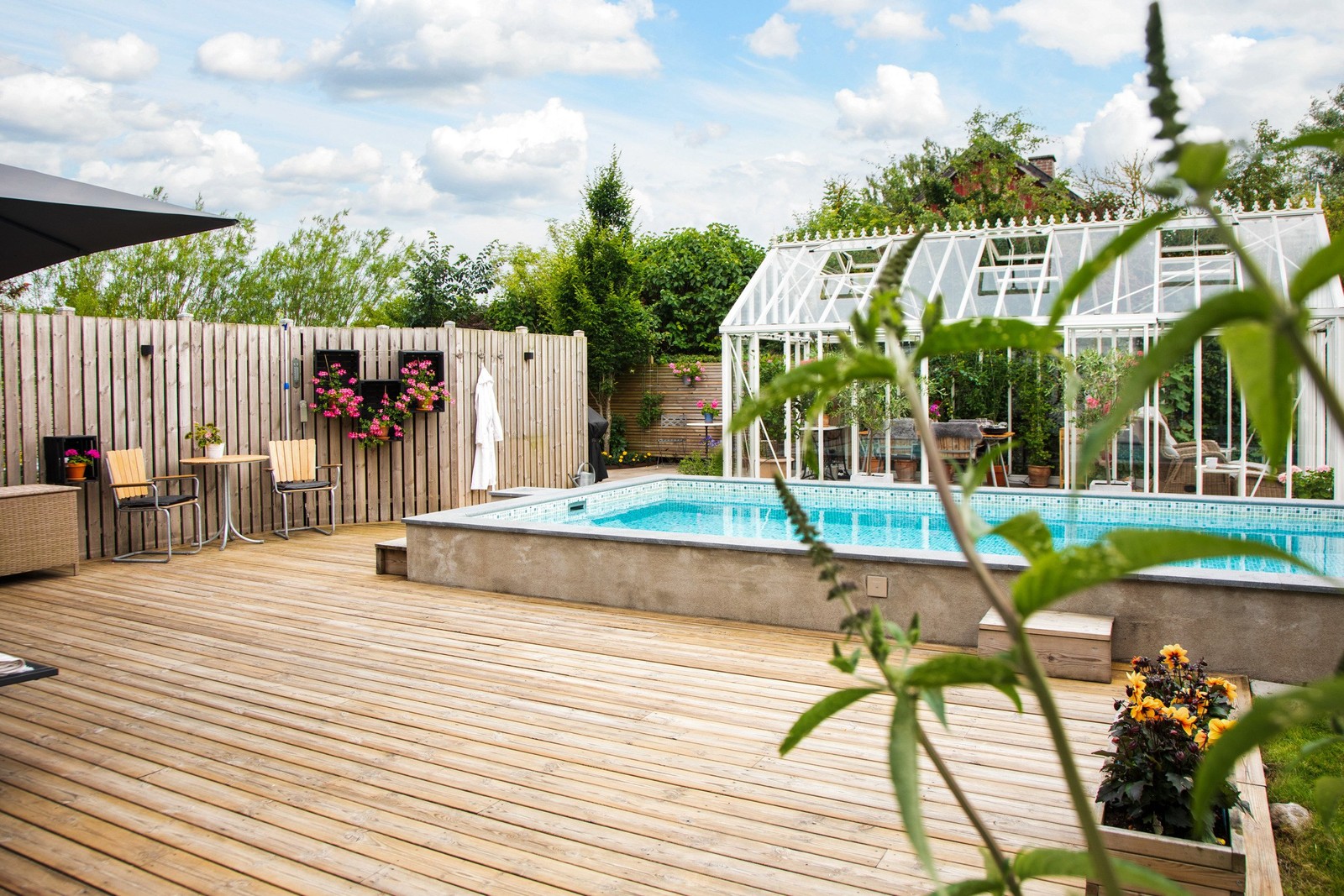 Bastu för 4-5 personer, dusch och relaxhörna. Altandörrar som öppnas mot pool och badtunna som ligger några få steg bort.