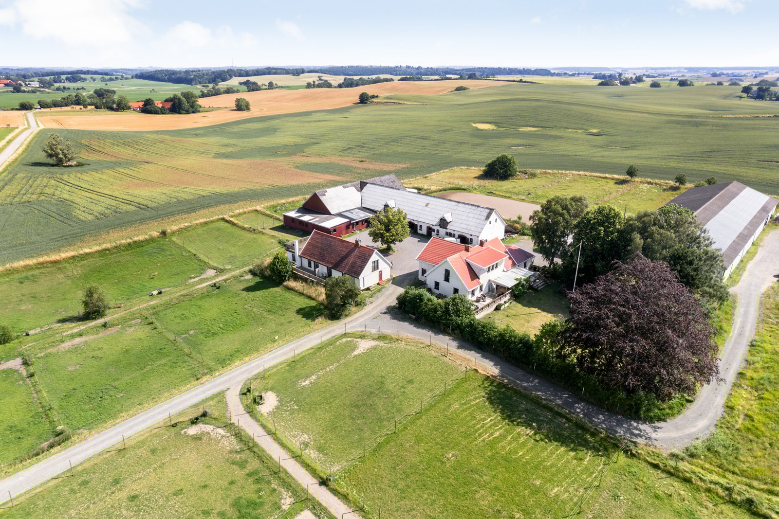 Det är här på Sydkusten som drömmen om ett fridfullt boende på landet med gott om utrymme för såväl gäster som hästar infrias. Gården som uppfördes 1937 och klassas som en säker gård består av ett totalrenoverat och delvis tillbyggt bostadshus om hela 338 kvm, en länga med två lägenheter (total boyta 320 kvm), en mindre separat lägenhet om 48 kvm, ett stort ridhus och en stallbyggnad med 25 boxar, fyra sadelkammare, spolspilta och andra funktionella utrymmen. På den 12 hektar stora marken finns en ridbana och hagar. Hela gården präglas av en hög standard där löpande renoveringar och underhåll har utförts liksom större investeringar såsom installation av nya fönster, jordvärme och solceller för att skapa ett bekvämt och energisnålt boende. Lägenheterna bidrar ytterligare till intäkter och hålla nere kostnaderna.