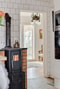 Bakom en klassisk vinröd dörr träder ni in i bostadshusets huvudentré där en rymlig och ljus hall välkomnar. På golvet ligger ett ljust klinkergolv som fortsätter vidare in i matsalen och köket intill. I anslutning till hallen finns ett nyrenoverat badrum som är stilfullt inrett med kakel och klinker i ljusgrått, wc, svart tvättställskommod och dusch bakom glasdörrar. I hallen finns trappan som leder upp till andra våningen.