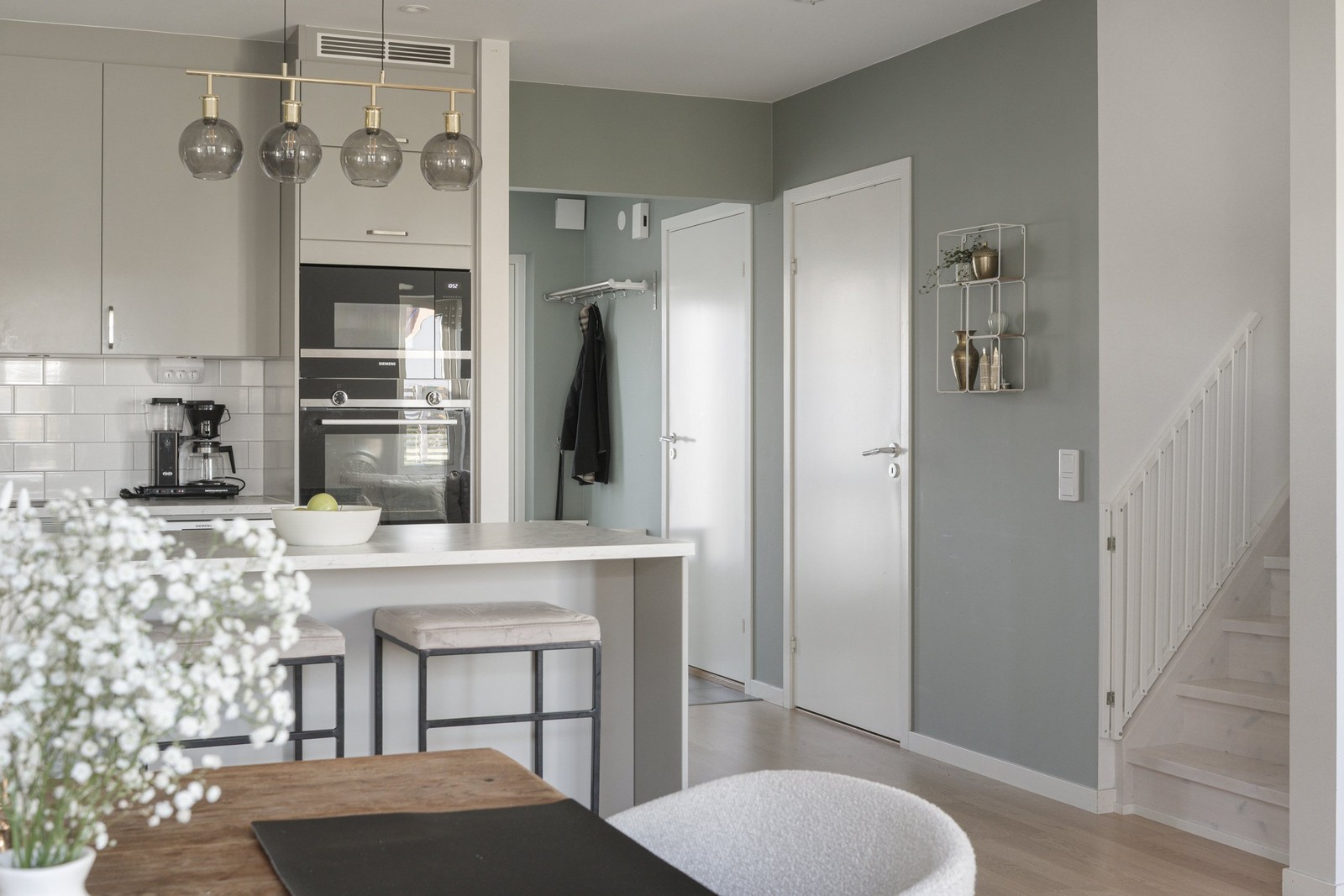 På entréplanet möts du av en öppen och social planlösning där kök och vardagsrum smälter samman på ett naturligt sätt. Det stilrena köket har köksö, gott om arbetsyta och plats för både matlagning och umgänge. Härifrån når du den soliga uteplatsen med trädäck och gräsmatta – en perfekt förlängning av vardagsrummet under sommaren. På detta plan finns även ett helkaklat badrum med dusch samt en separat tvättstuga med bra förvaringsmöjligheter.