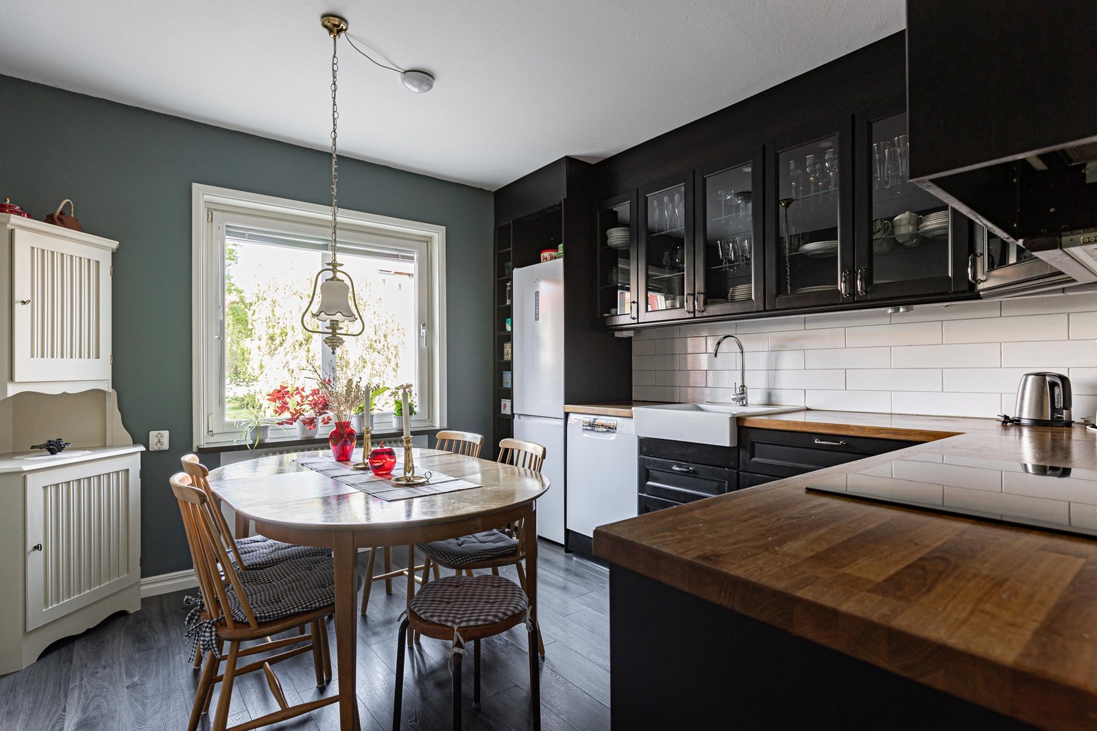 Stilrent kök med matplats invid fönster. Den maskinella utrustningen består av spis/ugn, mikro, diskmaskin, spisfläkt, kyl samt frys.