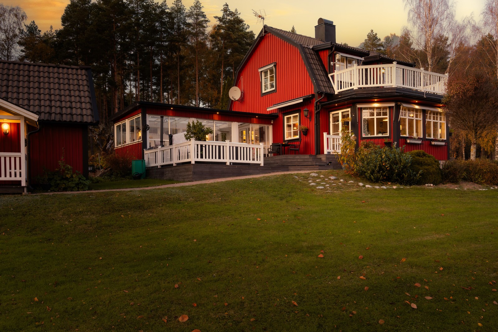 Huvudbyggnaden är smakfullt renoverad och erbjuder ett hem med ljus och rymd. På entréplan välkomnas du av ett inbjudande kök och en matplats med vacker utsikt genom burspråket. Vardagsrummet flödar av ljus och har direkt access till ett inglasat uterum samt ett stort altandäck med SPA-bad – den perfekta platsen för avkoppling året runt. Här finns även ett elegant matrum med kakelugn samt en gästtoalett.