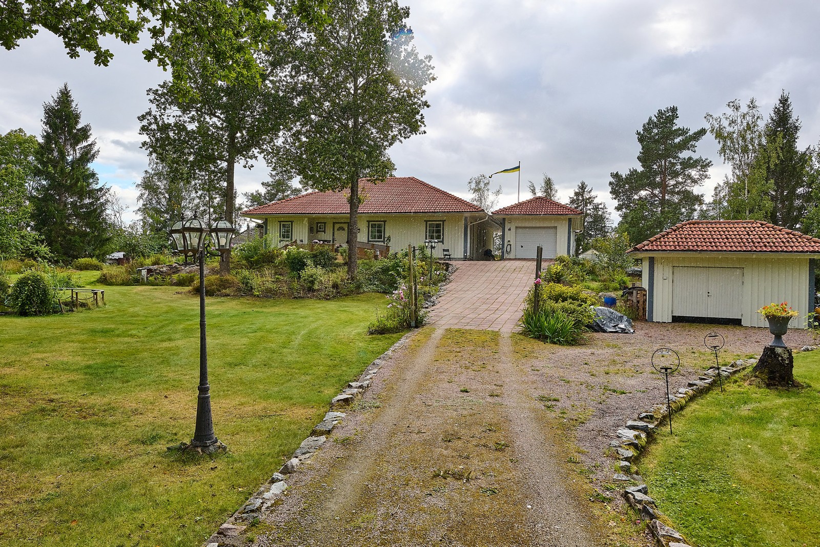 Längst in på en lugn återvändsgata väntar denna trivsamma villa med tre sovrum, generös altan med pool, lummig tomt och skymtande sjöutsikt.