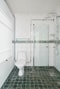 Helkaklat badrum med wc, handfatskommod och dusch.