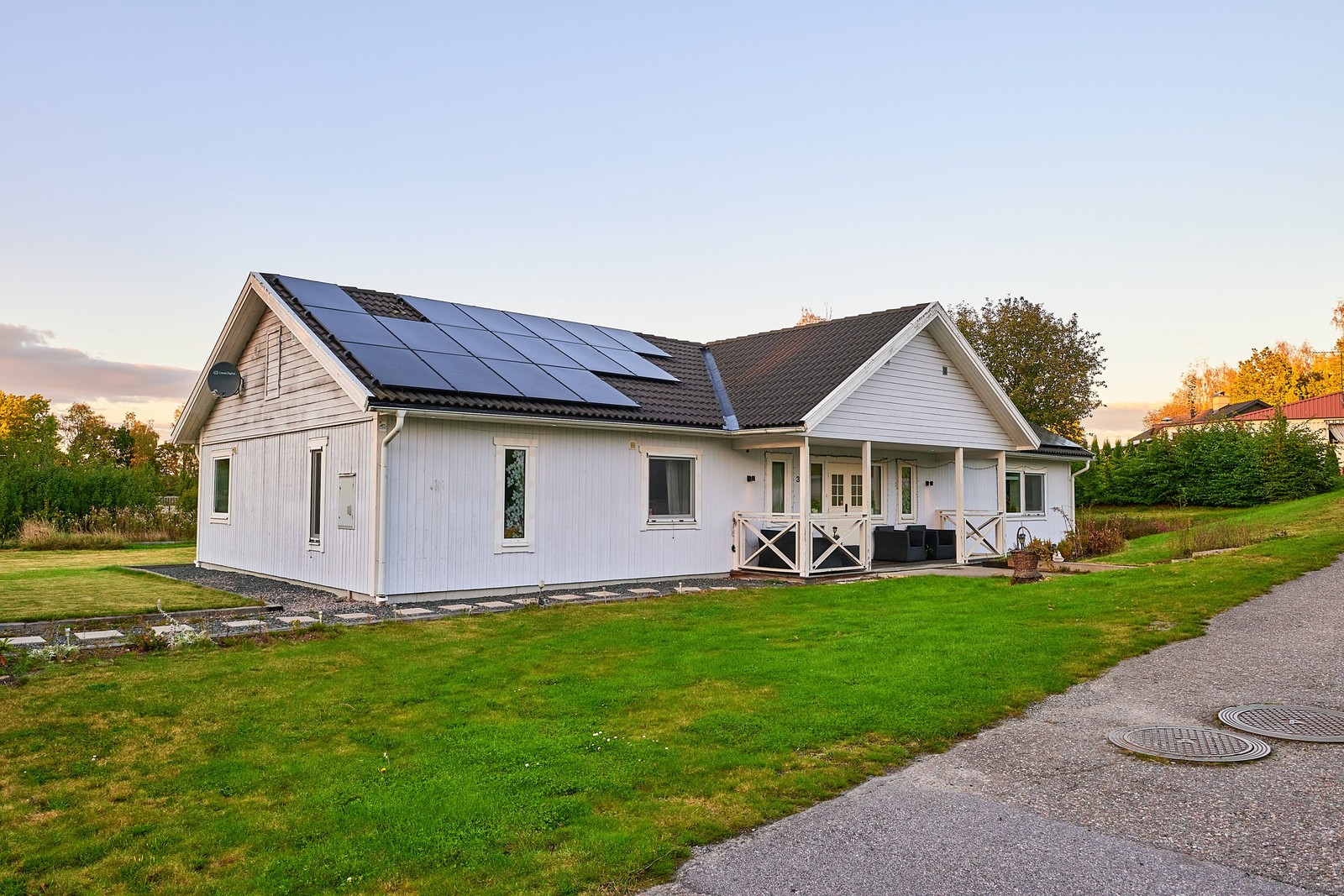 Huset är utrustat med solceller och batteri för en hållbar och energieffektiv vardag. Utomhus väntar en stor, grönskande gräsmatta och en härlig altan på baksidan som bjuder in till avkoppling och umgänge under soliga dagar. För bilägaren finns ett tilltaget garage med plats för två bilar, gott om förvaring, laddbox och en rymlig uppfart med plats för flera bilar.