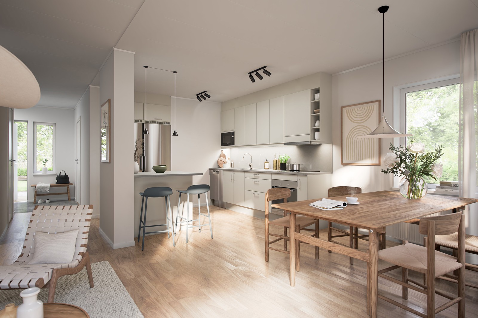 Med noggrant utvalda material och inredning från bland annat Kährs, Bosch och HTH bjuder bostäderna på en genomgående hög standard – redan från start. Planlösningarna är smarta och flexibla, med tre eller fyra sovrum, två badrum, gott om förvaring och sociala ytor som knyter samman kök och vardagsrum. Varje bostad får dessutom en egen uteplats och mindre trädgård som bjuder in till vardagsnjut.