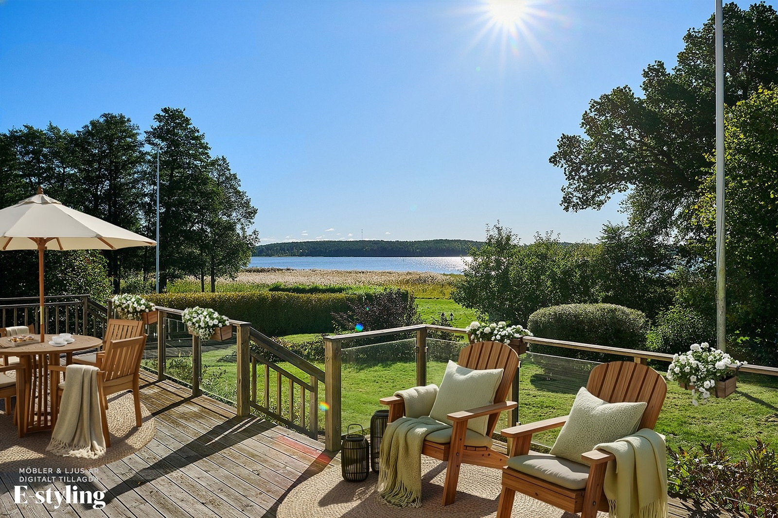 Tomten är generös, lummig och vackert planerad med öppna gräsytor, plats för lek, odling eller bara stilla stunder i solen. Den stora altanen bjuder på en svårslagen utsikt, här kan du duka upp till sommarens middagar under bar himmel eller slå dig ner i det inglasade uterummet och njuta av naturen oavsett väder. Det är en plats som inbjuder till långa frukostar, kvällsgrillningar och avkopplande stunder med utsikt mot horisonten.