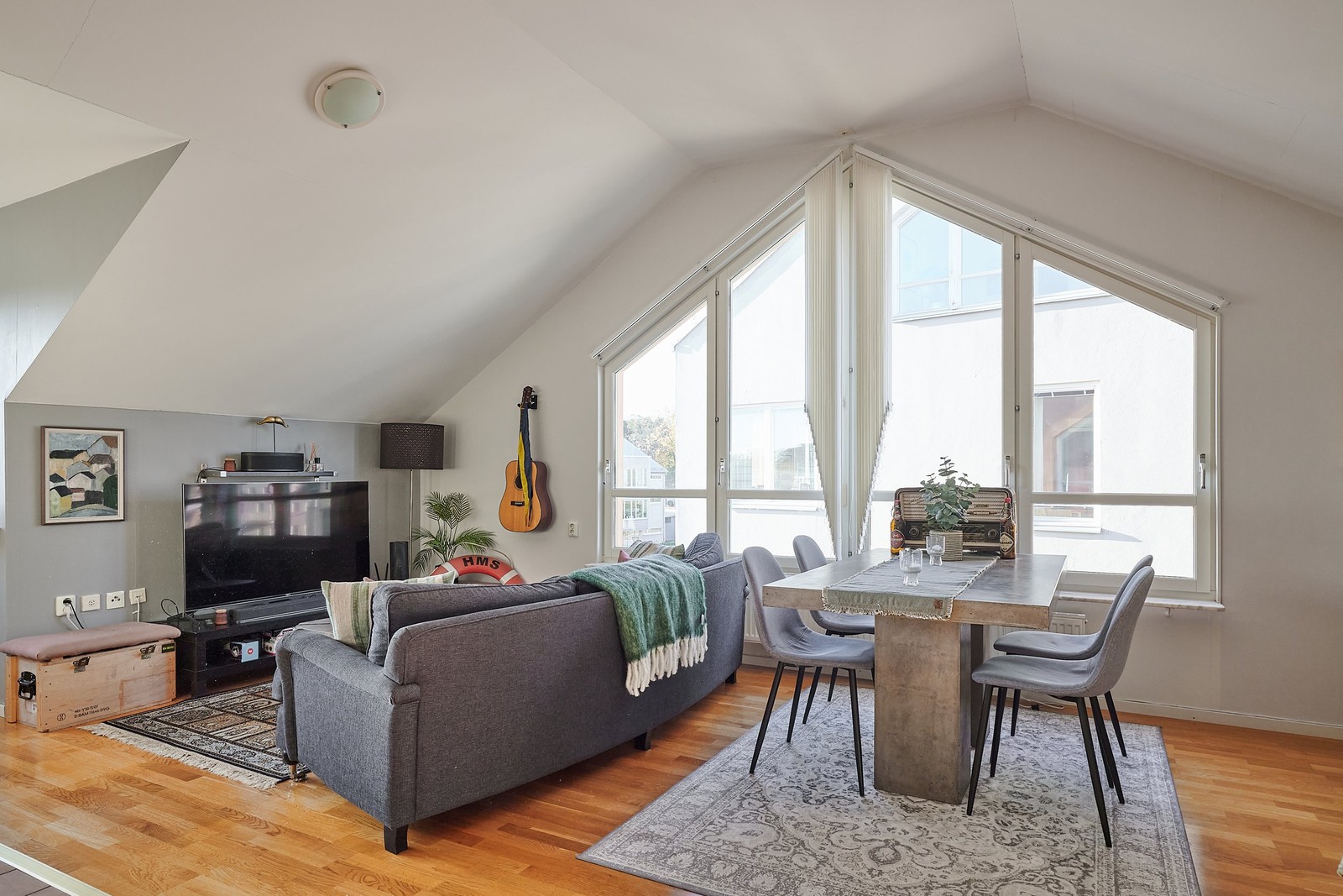 Planlösningen är smart och genomtänkt med öppna ytor där varje kvadratmeter nyttjas till fullo. De vackra detaljerna, som takets snedvinklar, det stilrena köket och det fina ljusinsläppet, skapar en känsla av både rymd och personlighet. Här bor du med närhet till stadens caféer, butiker och stationen men ändå med ett lugn som bara den översta våningen kan erbjuda.