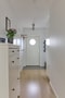 Inbjudande hall med klinker på golv och målade väggar. Förvaring i garderob.
