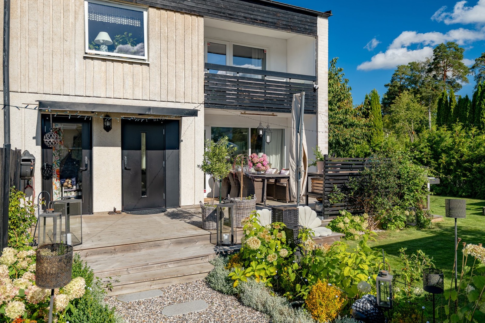 Totalrenoverat gavelradhus med ogenerade uteplatser och dubbelgarage