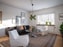Vackra pardörrar i original öppnar upp till ett spatiöst vardagsrum med plats för både soffgrupp och matsalsdel. Vardagsrummet har ett litet v-format burspråk och två stora fönster mot baksidans altan och trädgård.