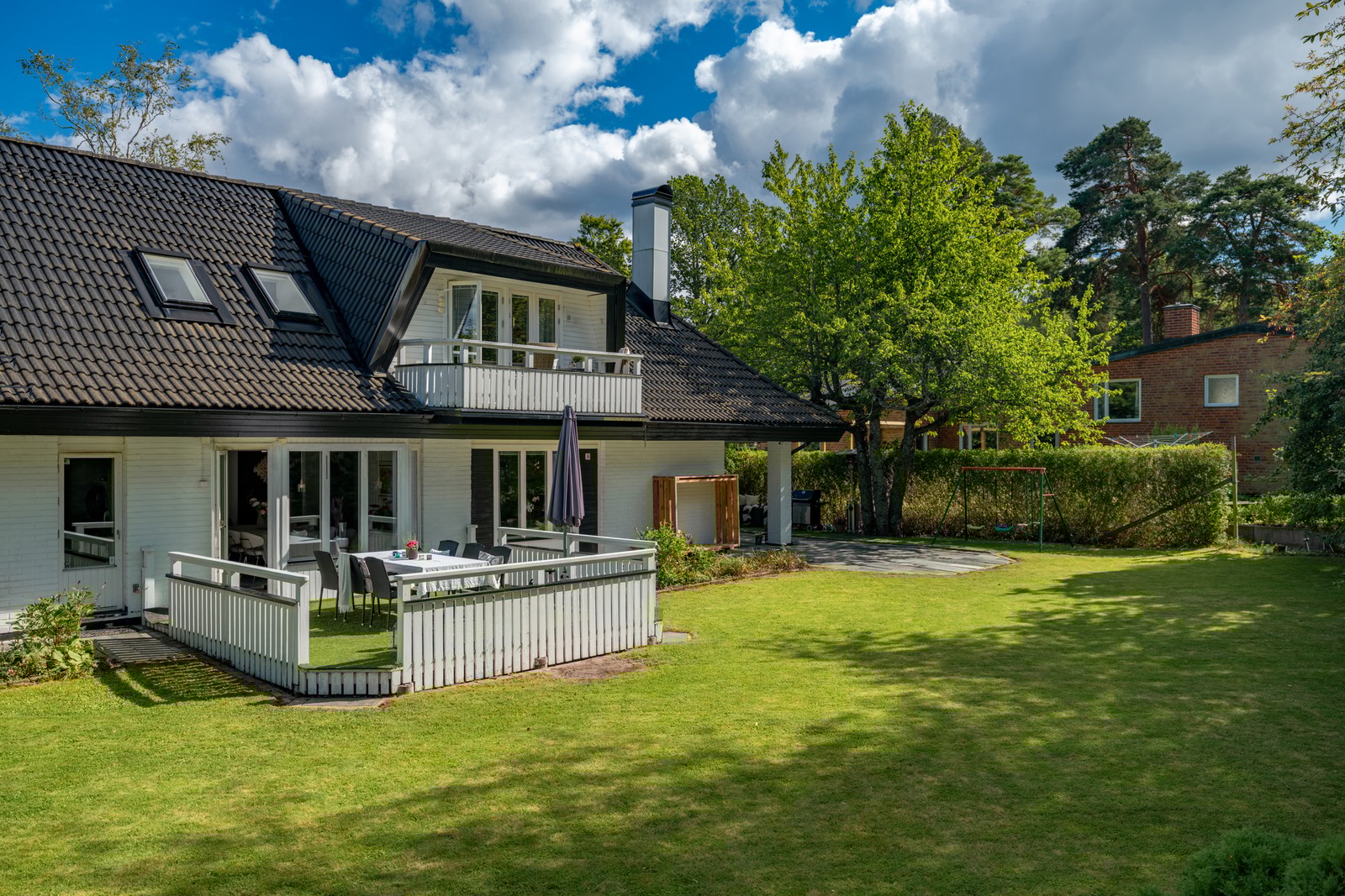 Trivsam, välplanerad villa med flera uteplatser och suveränt läge mitt i Enebyberg