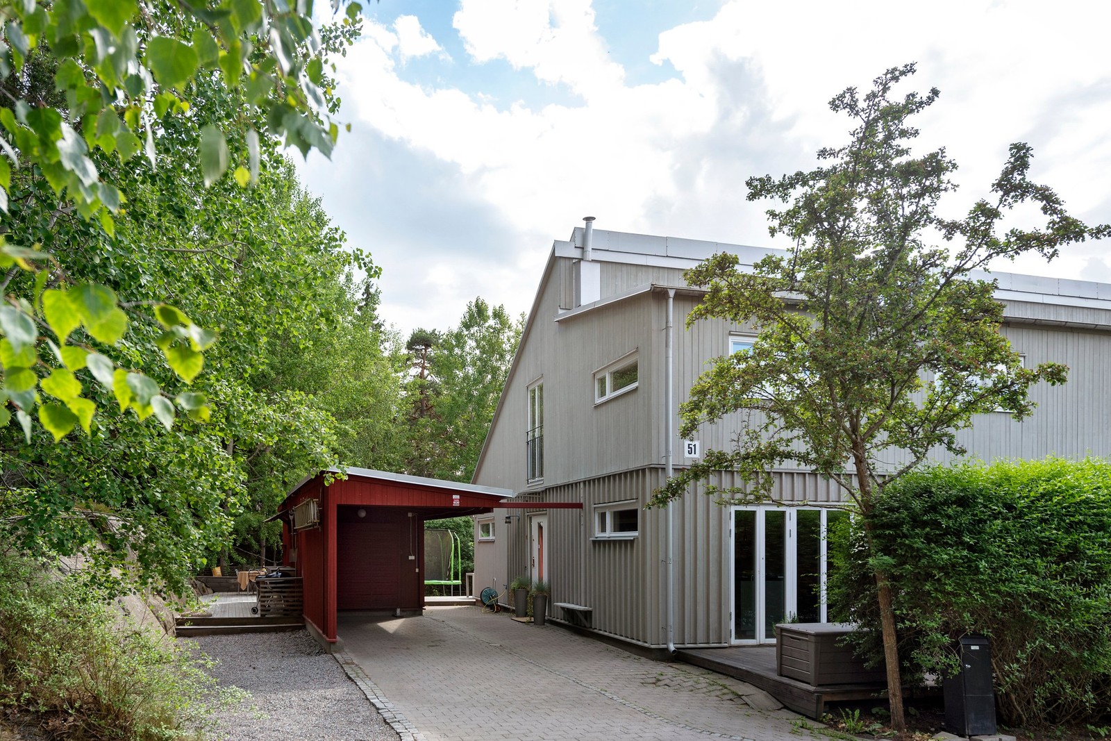 Den rymliga uteplatsen är en av de största i området, då även ytan bakom carporten har utnyttjats. Här finns två separata altandäck – ett direkt anslutet till huset, perfekt för matgrupp och loungemöbler i solsäkert sydvästläge, och ett mer avskilt längre in på tomten, omgiven av natur och berg. Hörntomten ger extra rymd och skapar en skyddad känsla.