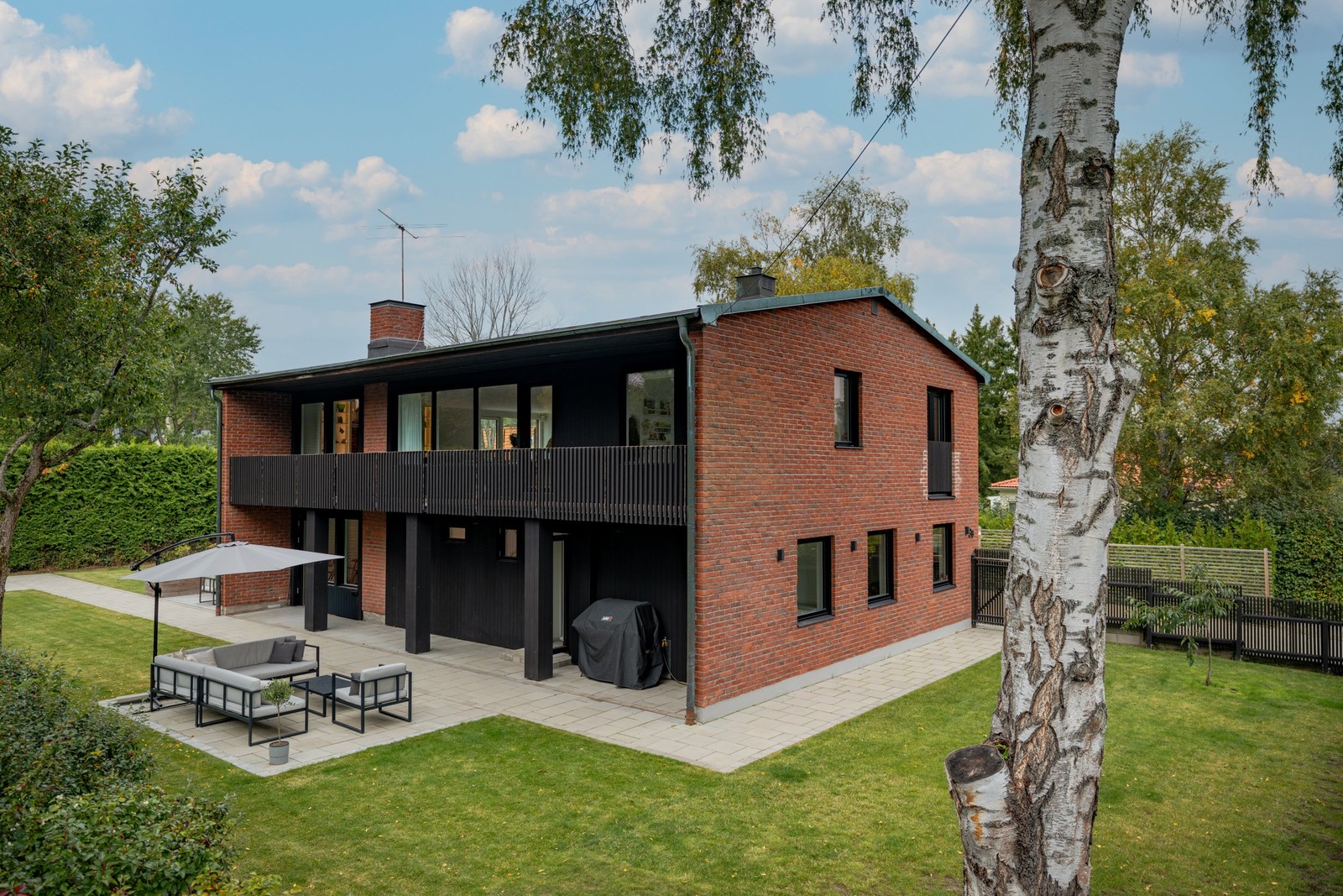 Huset är en gedigen och tidstypisk 60-talsvilla som moderniserats på ett fantastiskt fint sätt med exklusivt kök, eleganta badrum, flera platsbyggda förvaringslösningar och vackra materialval, från de ljusa parkettgolven till trapphuset med glasräcken. Uteplatsen på baksidan är väldigt solig tack vare söderläget, detsamma gäller balkongen. Det finns också en uteplats mot väster och kvällssolen.