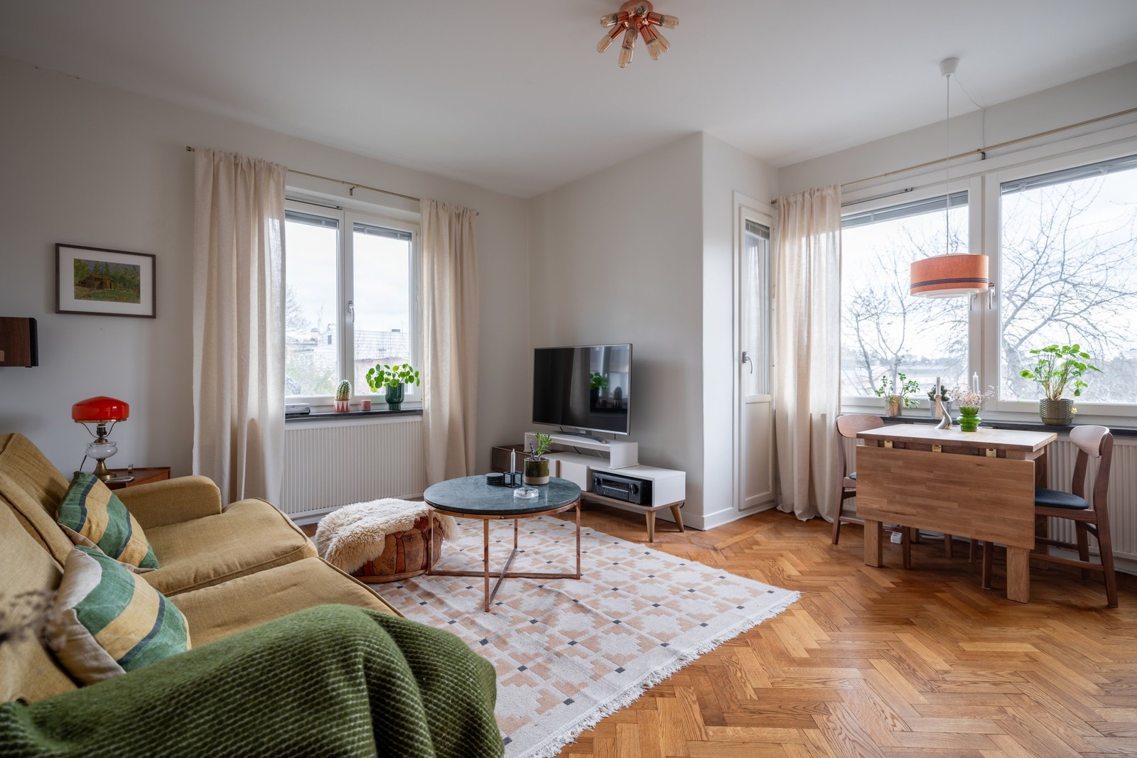 Vardagsrum med vackert parkettgolv och ljust målade väggar. Här finns plats för större soffgrupp och matplats samt övrigt möblemang. Rummet har härliga fönsterpartier med ett fantastiskt ljusinsläpp från två väderstreck och utgång till en fantastisk balkong.