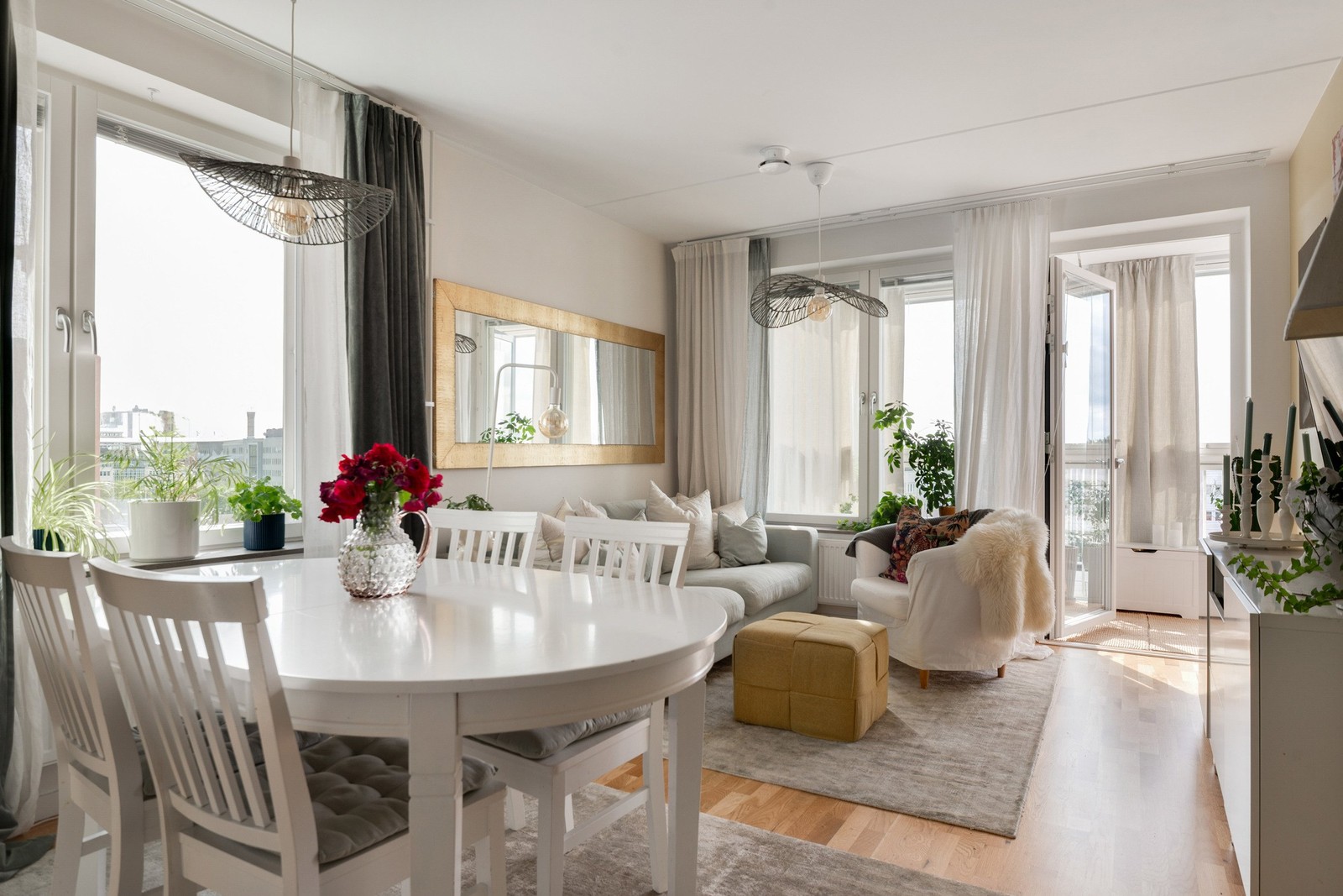 Här erbjuds ett hem i mycket fint skick där smakfull design, genomtänkta materialval och en flexibel planlösning möter vardagens behov. De stora fönsterpartierna i tre väderstreck fyller bostaden med ljus och förstärker känslan av rymd, samtidigt som exteriören och de karaktäristiska hörnfönstren i det stora sovrummet ger associationer till klassiska New York-bostäder.