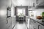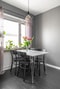 Stilrent och smakfullt renoverat kök imponerar med sin moderna design och genomtänkta planlösning. De grå skåpsluckorna kombineras snyggt med mörka bänkskivor och ett matchande grått kakel som stänkskydd.
