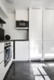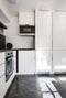 Bostaden präglas av ljus och rymd med ett stilrent kök i modern svartvit design, där släta vita luckor möter mörkare detaljer i en tidlös kombination. Här finns gott om arbetsytor och plats för både vardagens måltider och sociala stunder. På entréplanet finns även ett rymligt sovrum samt ett badrum med dusch och tvättmaskin – praktiskt och funktionellt för familjens behov.