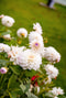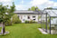 Välskött trädgård med fina planteringar, gräsmatta och växthus. På baksidan finns trädäck, pool med pooltak och flera ytor för umgänge och avkoppling.