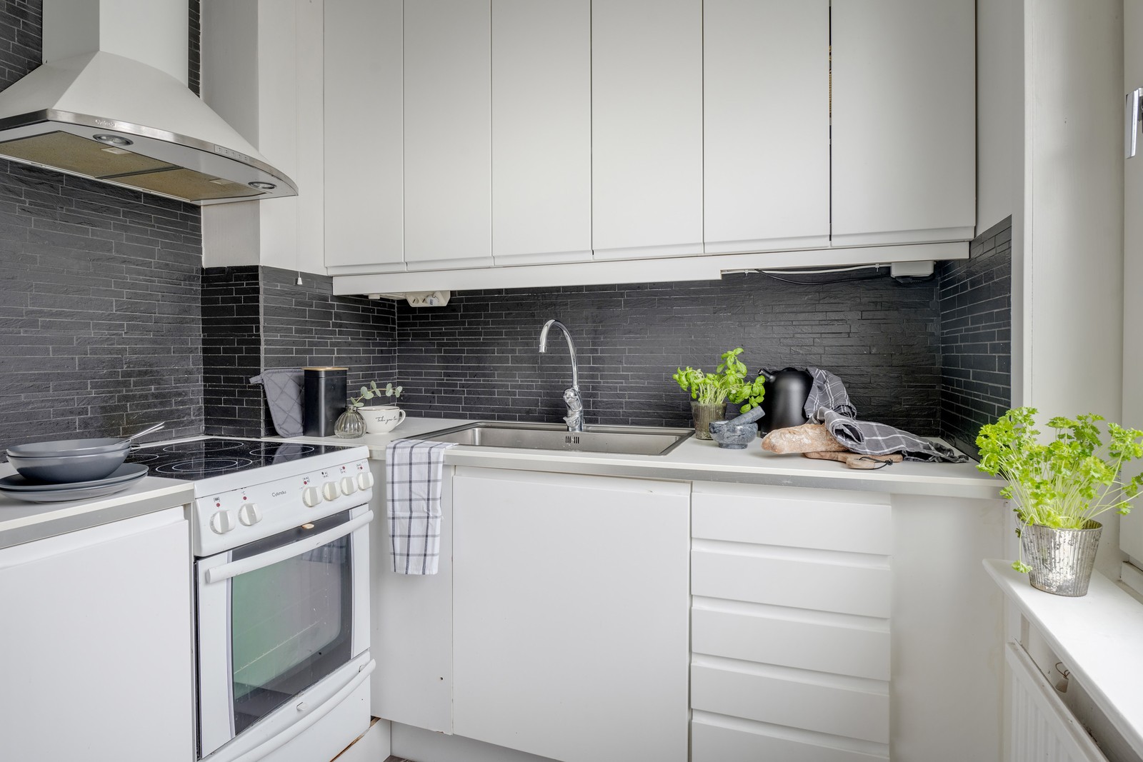 Kök med vita luckor samt svart kakel över diskbänk. Fläkt i vit färg. Framdraget för bänk diskmaskin.