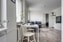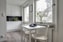 Köket är utrustat med vita köksluckor och kontrasteras vackert av svarta kakelplattor. Dessutom finns gott om plats för matbord, vilket gör detta hem perfekt för gemensamma måltider och sociala stunder.