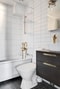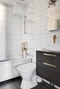 Renverat helkaklat badrum i sober färgsättning. Här finns dusch, handfat, kommod, toalett och spegel.
