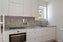 Praktiskt arbetskök med vita köksluckor, inbyggd mikrougn, induktionshäll, kyl/frys, diskmaskin och inbyggnadsugn. Fönster.