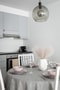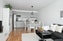 Ljust kök i öppen planlösning mot vardagsrum, parkettgolv, ljust målade väggar, kyl/frys, induktionshäll, fläkt, integrerad diskmaskin samt ugn och mikro.