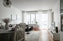 Ljust vardagsrum i öppen planlösning mot köket. parkettgolv, ljust målade väggar samt utgång till balkong.