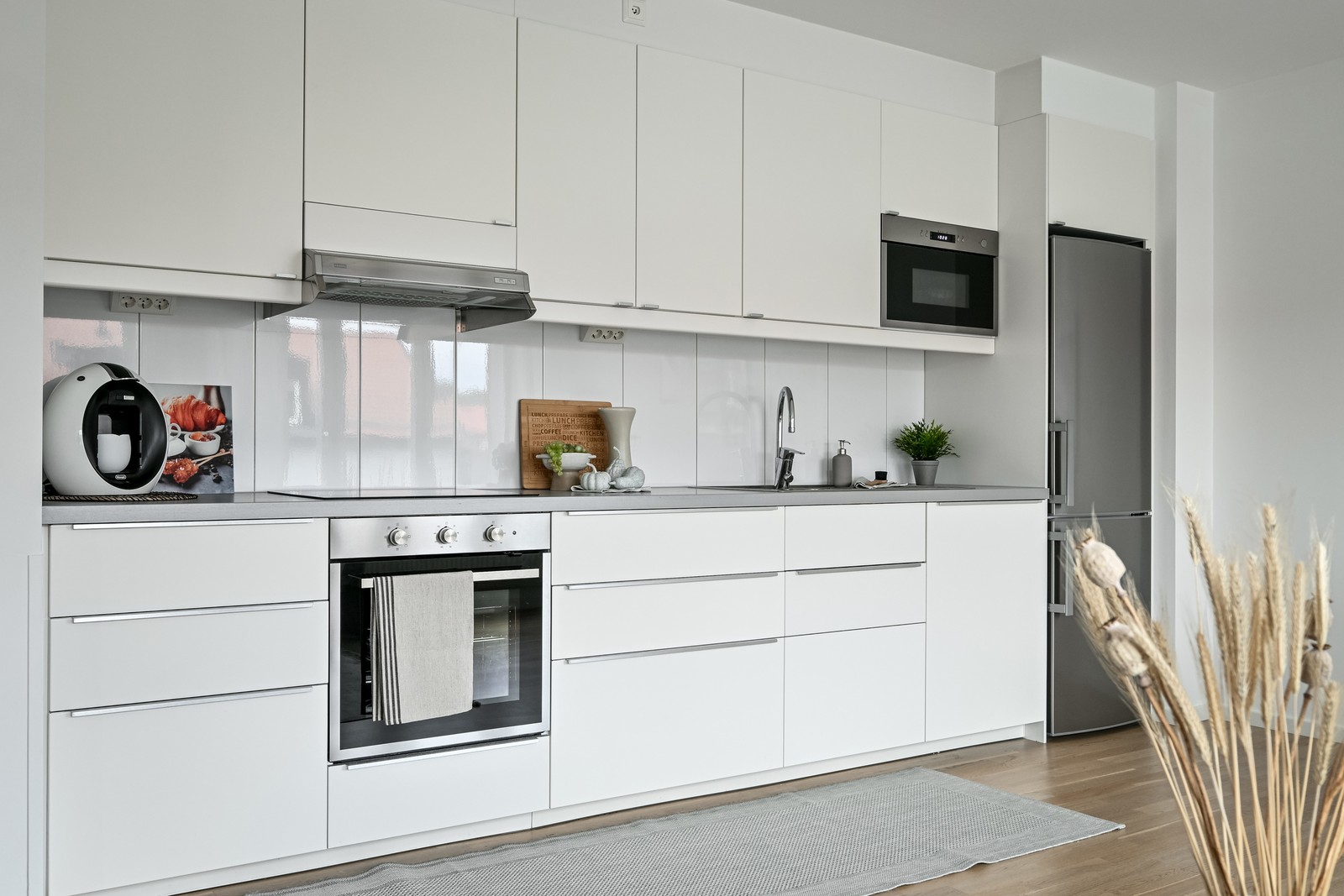Mycket stilfullt och ljust kök med gott om förvaring. Vitvaror som kyl, frys, häll, fläkt, mikro samt diskmaskin.