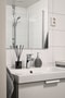 Badrummet har klinkergolv, tvättmaskin med inbyggd tork, wc, tvättställ med underskåp samt spegel, skåp med förvaring och duschvägg.
