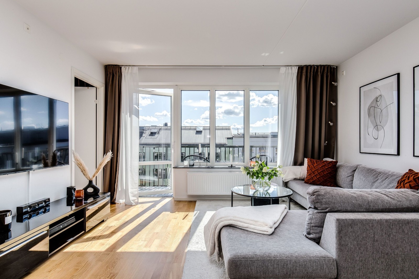 Rymligt vardagsrum med parkettgolv, bra ljusinsläpp från fönsterpartierna, parkettgolv samt utgång till den stora balkongen.