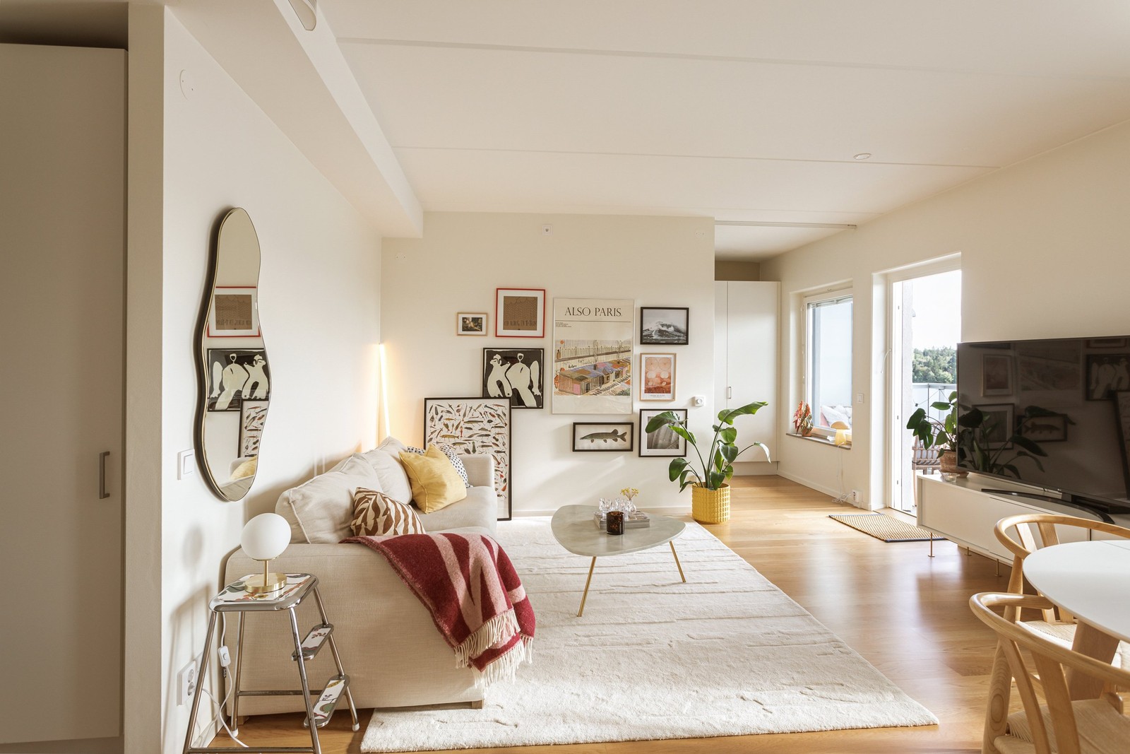 Rymligt vardagsrum med parkettgolv, stort ljusinsläpp från de stora fönsterpartierna, ljusa väggar, parkettgolv samt utgång till den representativa balkongen.