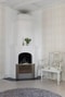 Allrum - Fint rum med furugolv och låg bröstpanel och tapetserade väggar.