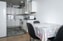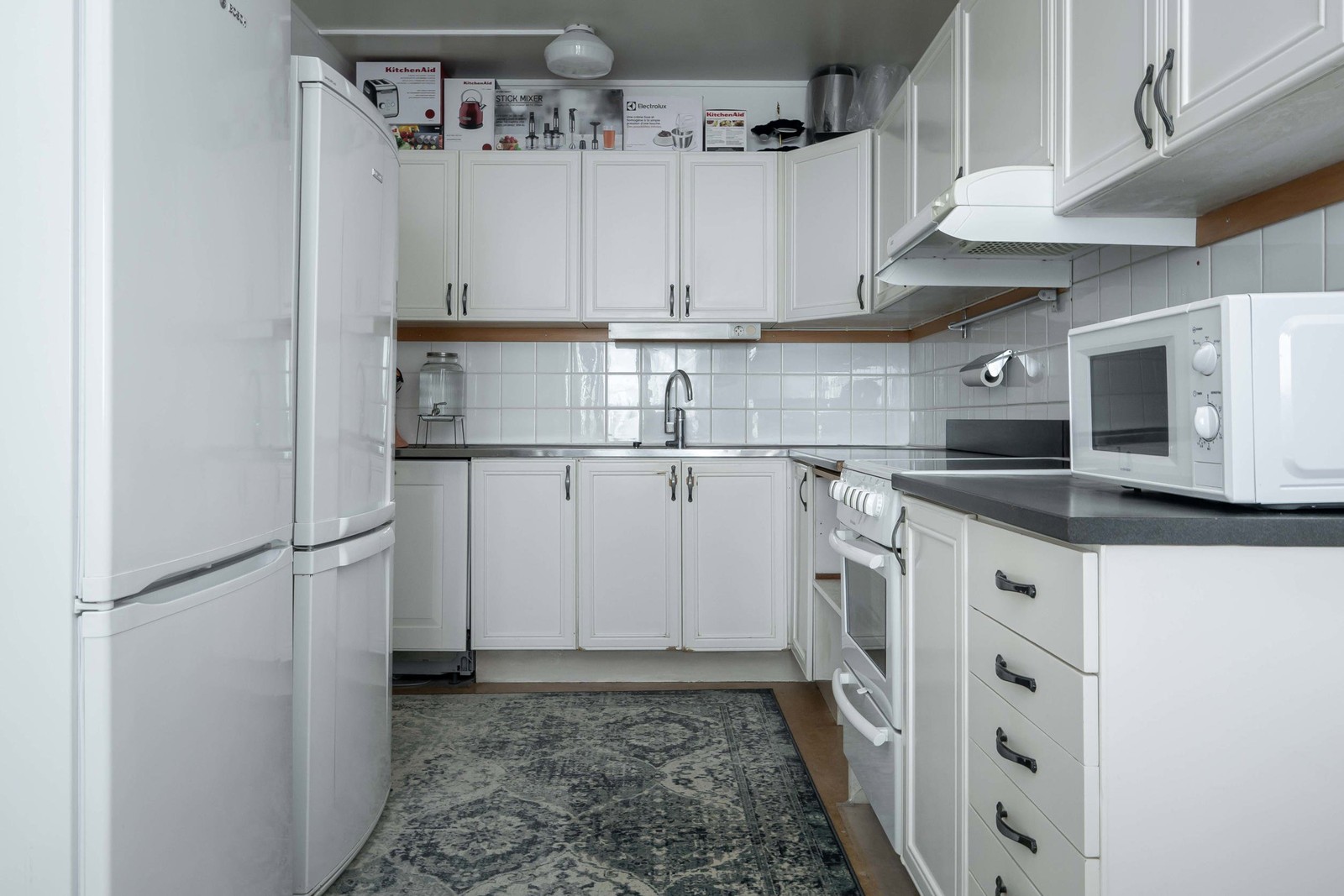 Ljust kök med vita skåpluckor utrustat med spis, fläkt och kyl/frys. I köket finns även en matplats för ca fyra personer samt utgången till den inglasade balkongen.