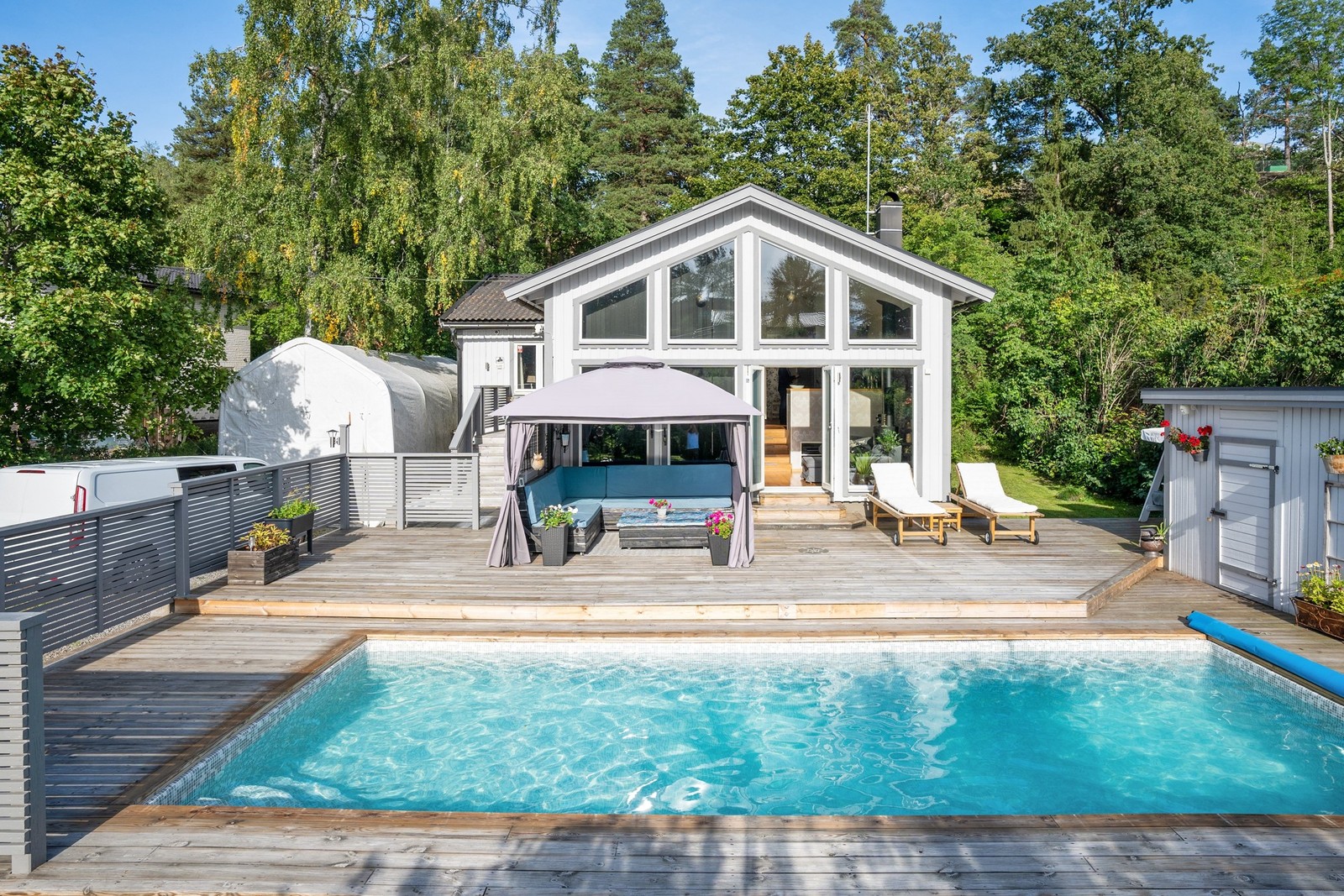 Fin trädgårdstomt med stor trädäckad uteplats med pool samt en terrass på husets baksida.